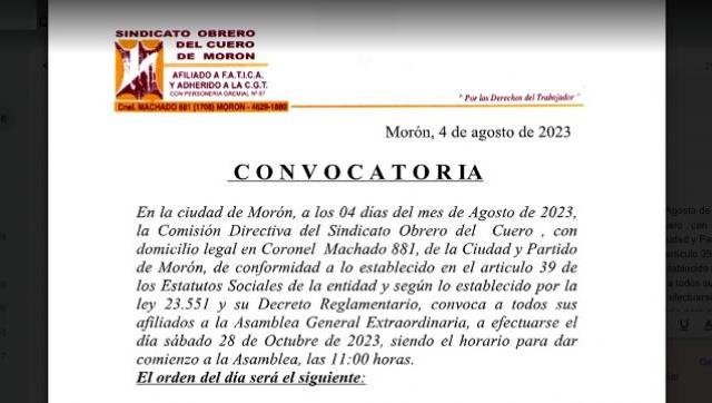 En la ciudad de Morón, a los 04 días del mes de Agosto de 2023, la Comisión Directiva del Sindicato Obrero del Cuero , con domicilio legal en Coronel Machado 881, de la Ciudad y Partido de Morón, de conformidad a lo establecido en el artículo 39 de los Estatutos Sociales de la entidad y según lo establecido por la ley 23.551 y su Decreto Reglamentario, convoca a todos sus afiliados a la Asamblea General Extraordinaria, a efectuarse el día sábado 28 de octubre de 2023, siendo el horario para dar comienzo a la Asamblea, las 11:00 horas.