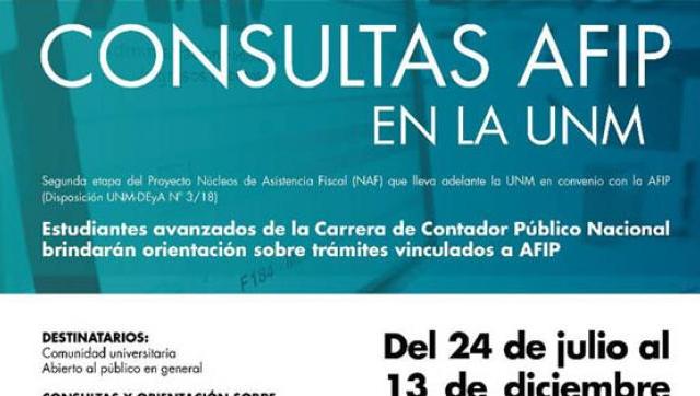Esta iniciativa forma parte del Proyecto Núcleos de Asistencia Fiscal (NAF) que la UNM lleva adelante en convenio con la Administración Federal de Ingresos Públicos (disposición 3/2018 DEyA). Este espacio funcionará los días miércoles de 17 a 20 hs. y viernes de 10 a 20 hs. en el aula b201a del edificio histórico.