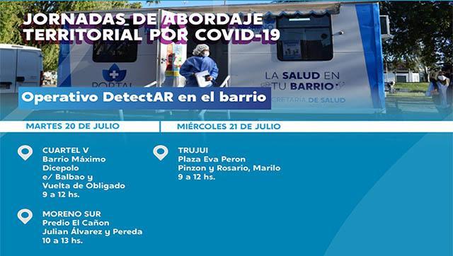 - Martes, 20 de Julio – Cuartel V - Barrio Máximo, en la calle Discépolo entre Balbao y Vuelta de Obligado, de 9 a 12 horas – Moreno Sur – en el predio “El Cañón”, en las calles Julián Álvarez y Pereda, de 10 a 13 horas.