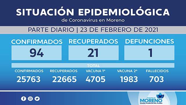 Al día de hoy, en el Municipio de Moreno hay 94 nuevos casos confirmados, 21 personas recuperadas y 1 defunción. En total, suman 25763 casos confirmados, 22665 personas recuperadas y 703 defunciones. Además, 4705 personas ya recibieron la primera dosis de la vacuna y 1983 la segunda dosis.