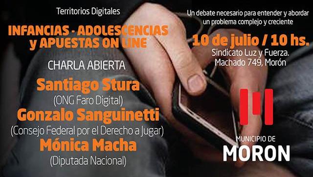 El Municipio de Morón organiza la charla ‘Infancias-Adolescencias y apuestas On Line’ con el fin de abordar, reflexionar y sumar herramientas que permitan atender una problemática que afecta cada vez más a las infancias y adolescencias. Será el próximo miércoles 10 de julio, a las 10hs., en la sede del Sindicato Luz y Fuerza (Machado 749, Morón).